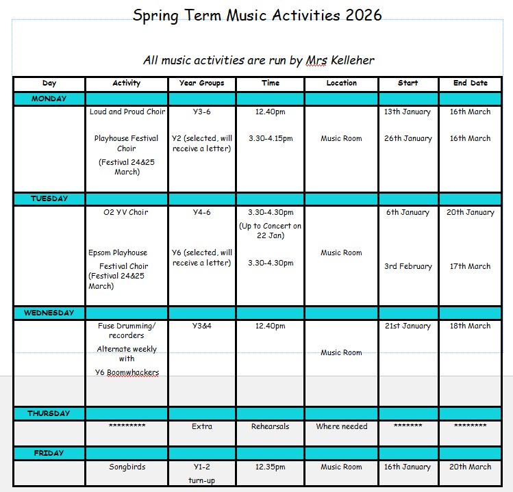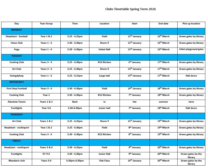 We have a wide range of clubs for children to enjoy after school. Please note that there are currently no clubs for those in Early Years. All clubs are run by independent providers and have their own terms and conditions. Please scroll down to view the music timetable.